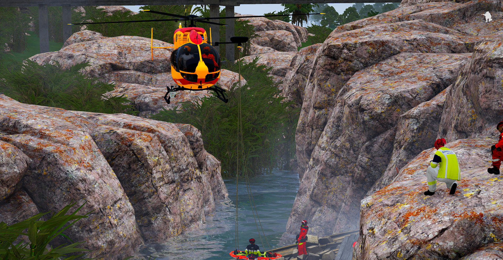 Une Volkswagen Scirocco chute d'un pont en bois, provoquant l'intervention du SAMU, des sapeurs-pompiers, de la Protection Civile et de l'hélicoptère EC-145 de la Sécurité Civile. Sur place, la voiture gît au fond du ravin, endommagée. Les sapeurs-pompiers déploient des cisailles hydrauliques pour désincarcérer les occupants tandis que le SAMU évalue l'état des blessés. La Protection Civile sécurise les lieux et aide à l'évacuation. L'hélicoptère EC-145 reste en vol stationnaire. Un sauveteur est hélitreuillé pour porter assistance aux victimes, qui sont ensuite hélitreuillées à bord et transportées à l'hôpital. L'opération, marquée par la coordination des équipes de secours, s'achève après de longues heures d'efforts.